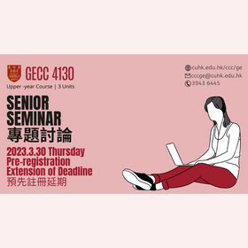 As announced earlier, students who would wish to attend GECC4130 “Senior Seminar” in 2023/24 should complete the required pre-registration with the College GE Office by March 20, 2023. An extension has been made to the pre-registration deadline, to 12:00 noon, March 30, 2023 (Thursday). Students who have not yet formed a complete group of four should submit the grouping assistance form as soon as possible (https://cloud.itsc.cuhk.edu.hk/webform/view.php?id=13663661). They will be assigned to a team by the College GE office.